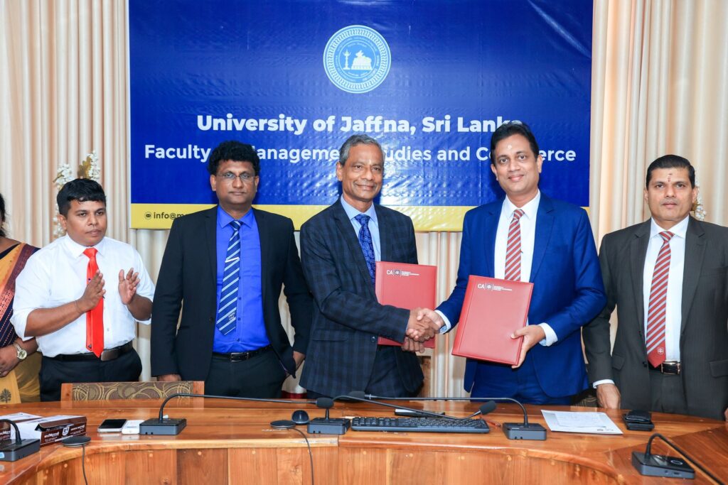 CA Sri Lanka renewed its Memorandum of Understanding with the Faculty of Management Studies and Commerce (FMSC) of the University of Jaffna on 4 August 2025, reaffirming its commitment to strengthening collaboration in the academic and professional education spheres. The ceremony was graced by with Prof. S. Srisatkunarajah, Vice Chancellor of the University of Jaffna, Prof. N. Kengatharan, Dean – Management Studies and Commerce, and Prof. P. Pratheepkanth, Head – Department of Accounting, along with Heshana Kuruppu, President of CA Sri Lanka, Tishan Subasinghe, Vice President, and Lakmali Priyangika, CEO.