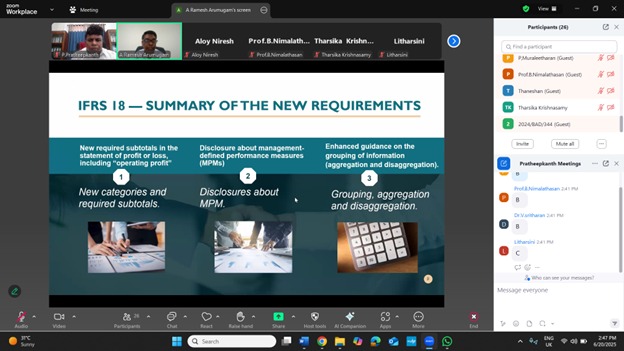 A session on IFRS 18: Presentation and Disclosure in Financial Statements was held for the academic staff of the Department of Accounting, University of Jaffna, Sri Lanka, on Friday, June 20, at 2:30 PM via Zoom. Dr. A. Ramesh Arumugam from the University of Westminster, UK, delivered the session.